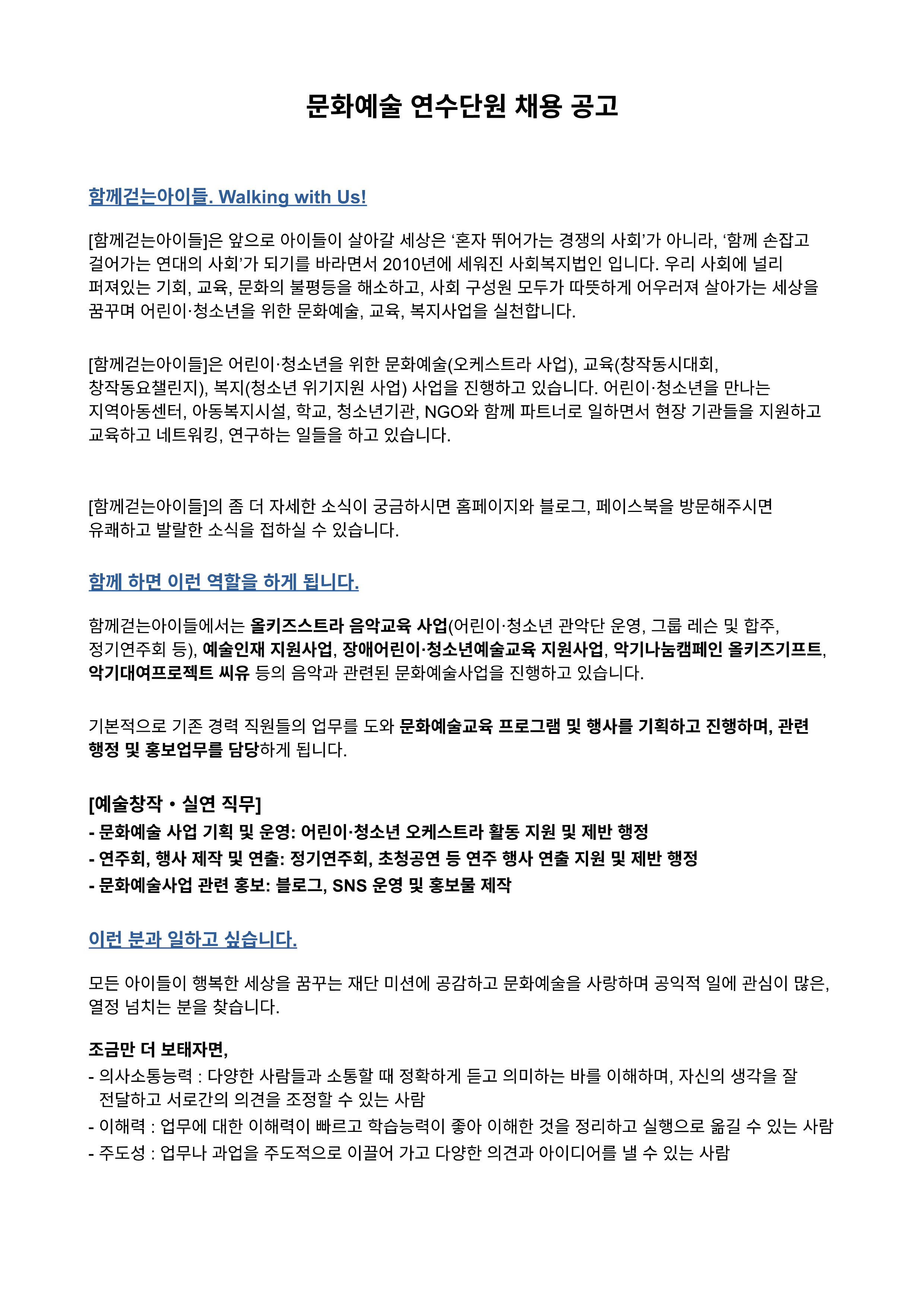 함께걷는아이들에서 연수 단원을 모집합니다.