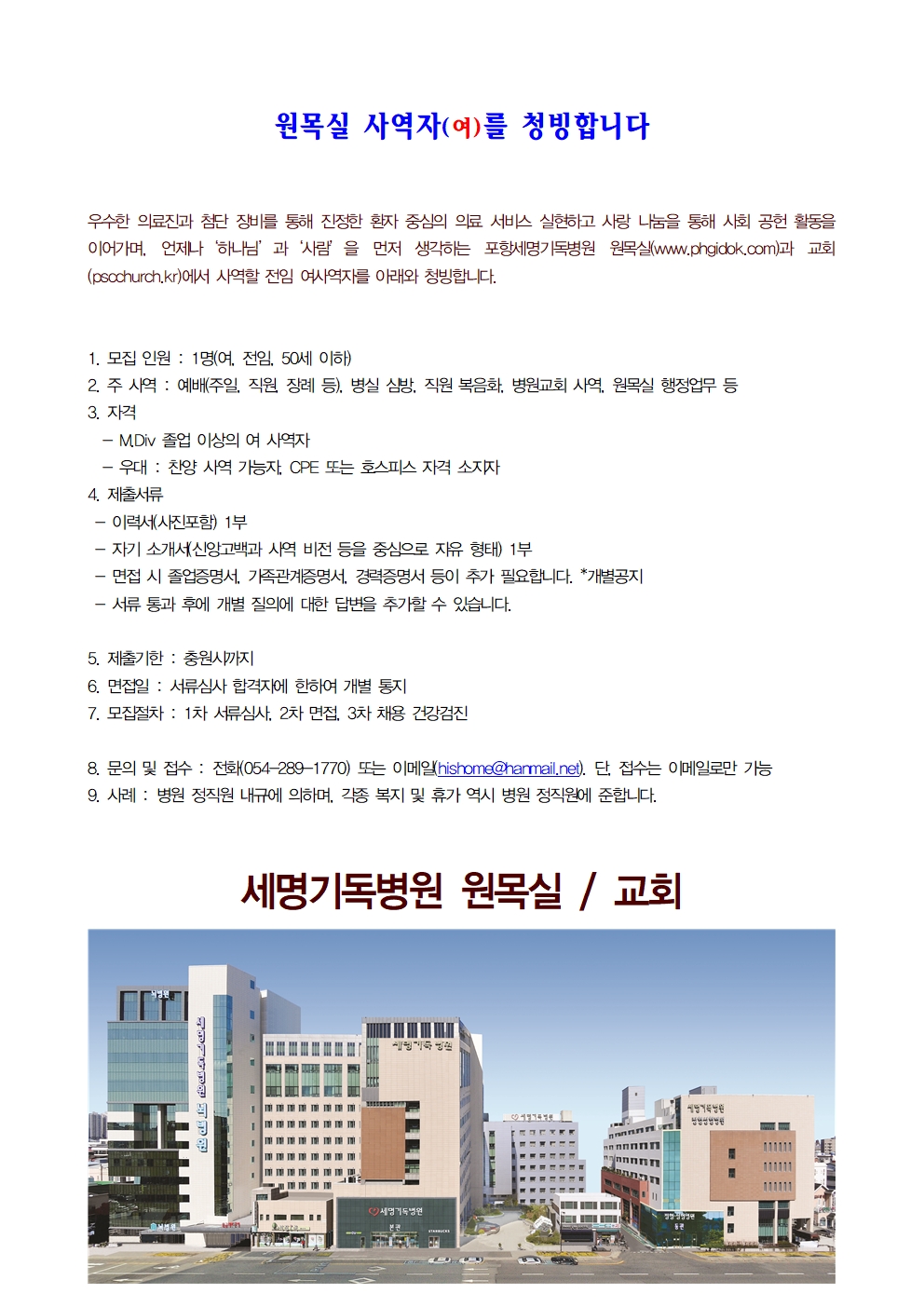 포항 [세명기독병원교회] 원목실 사역자(여)를 청빙공고