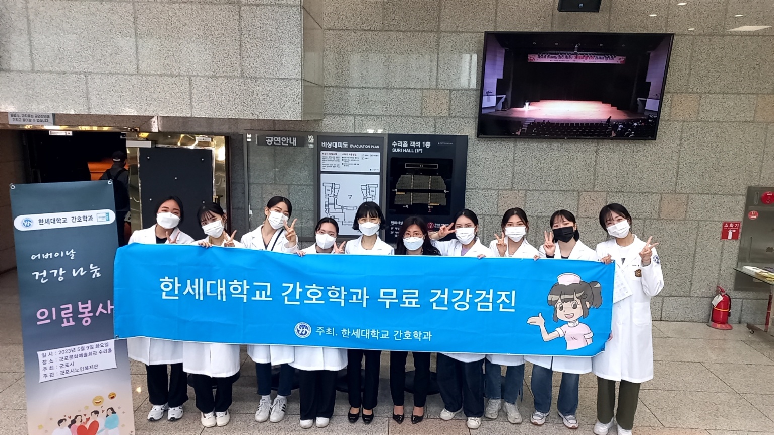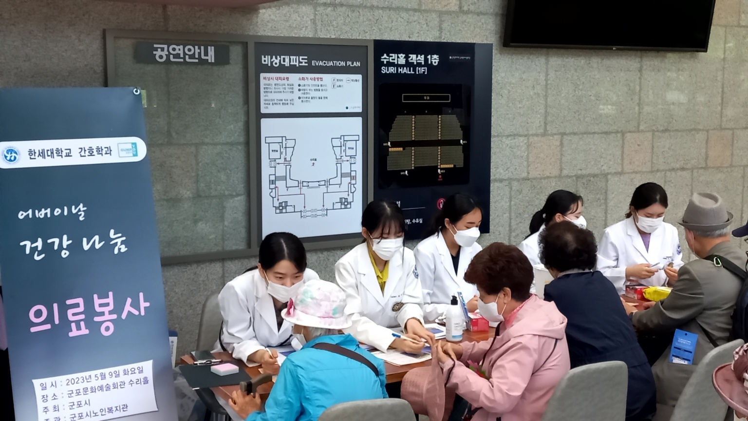 한세대학교 간호학과에서 2023년 05월 09일(화) 오후 1시에 군포문화예술회관 수리홀에서 간호학과 재학생 27명(의료봉사 및 행사진행 스태프 봉사)과 함께 교외 봉사를 진행하였다.