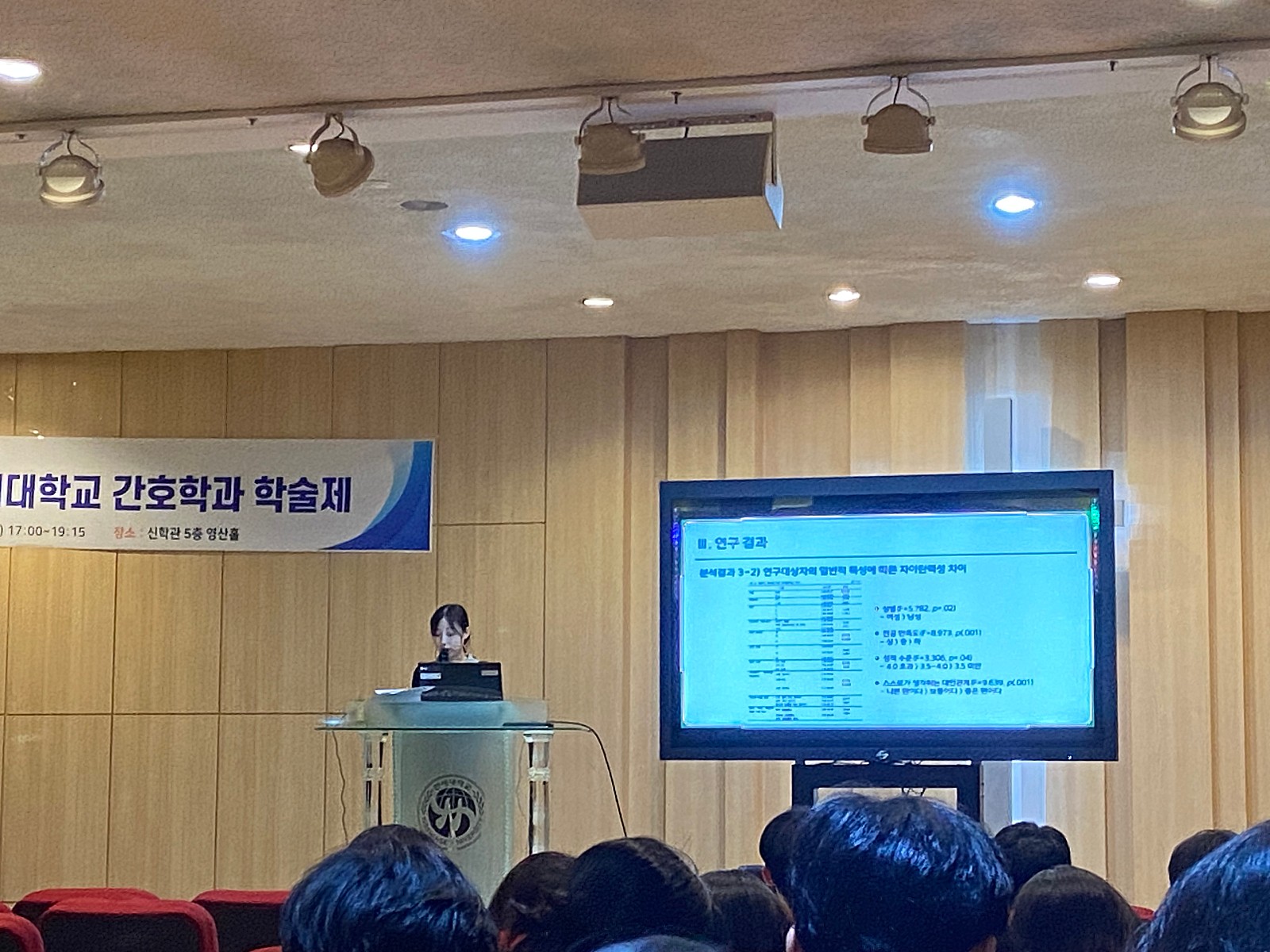 • 여섯 번째 팀: 권혜진 학생이 ‘간호대학생의 학업스트레스, 회복탄력성, 학업적 완벽주의 간의 상관관계’에 대해 발표함
