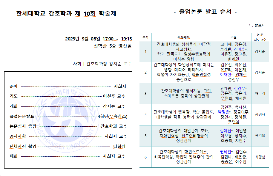 한세대학교 간호학과에서 2023년 09월 08일(금) 오후 17시에 신학관 5층 영산홀에서 간호학과 재학생들과 함께 '제 10회 한세대학교 간호학과 학술제'를 진행하였다.