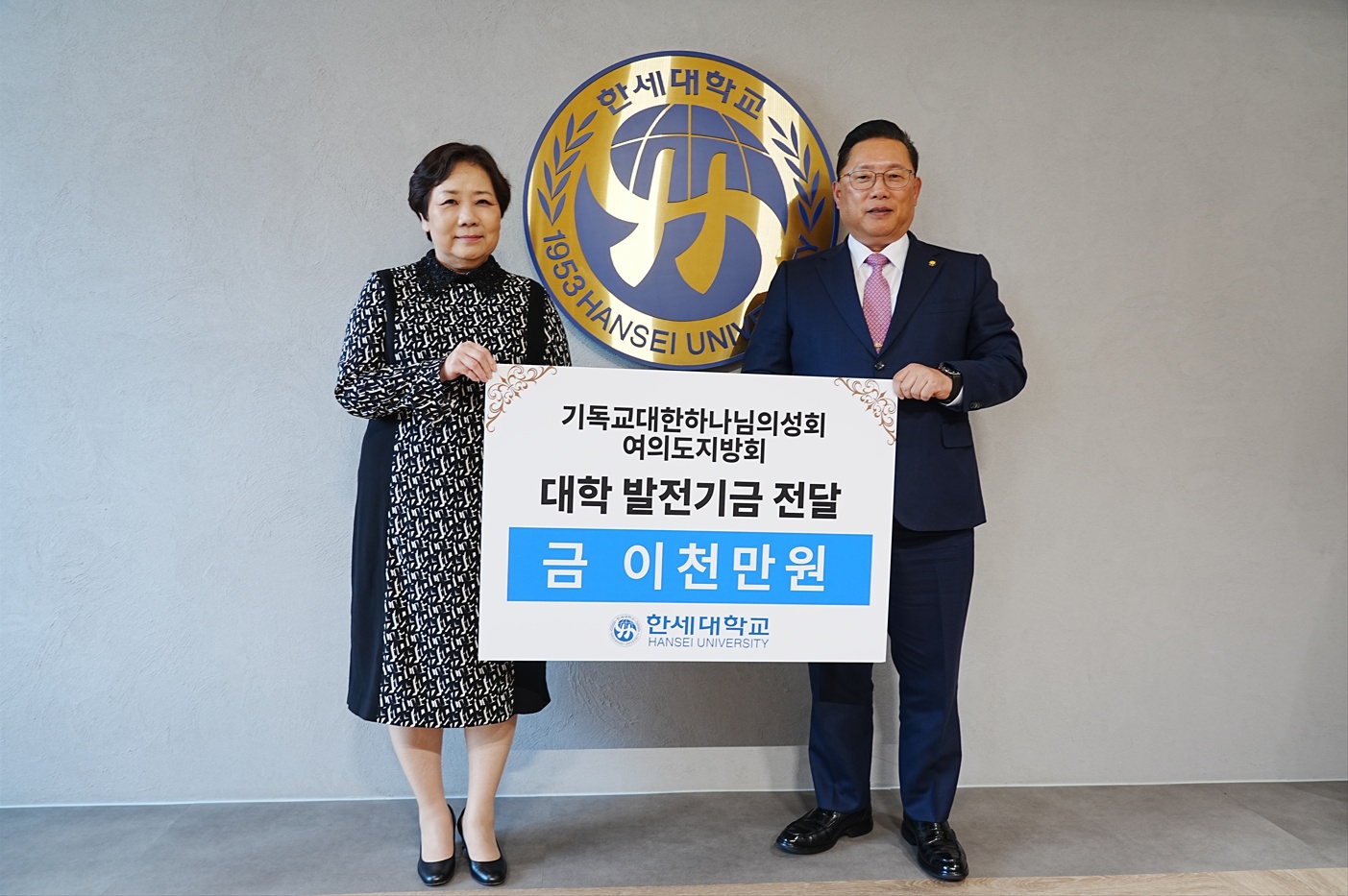 한세대학교(총장 백인자)는 대외협력처(최성훈 부처장) 주관으로 기독교대한하나님의성 회(이하, 기하성) 여의도지방회와 함께 발전기금 전달 및 감사패 증정 행사를 총장실에 서 17일 진행하였다.