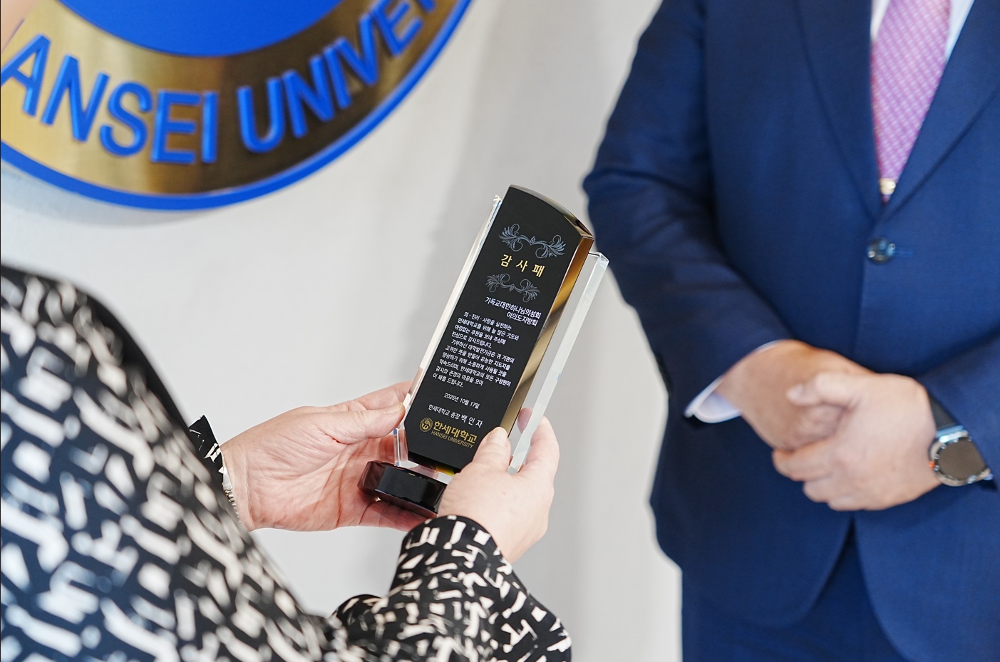 [사진 3. 발전기금 전달식 행사 중 감사패 배경 기념사진 1]