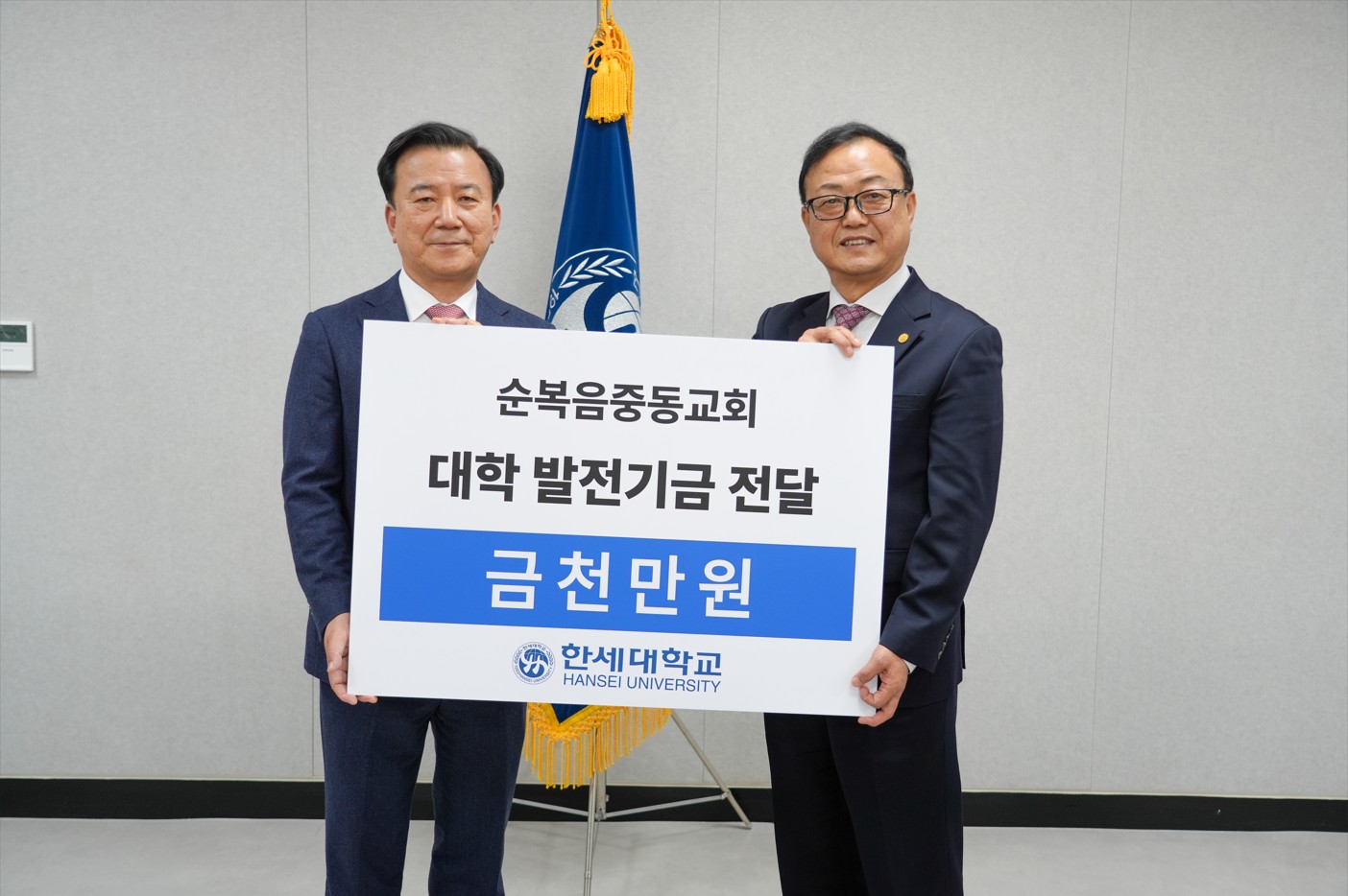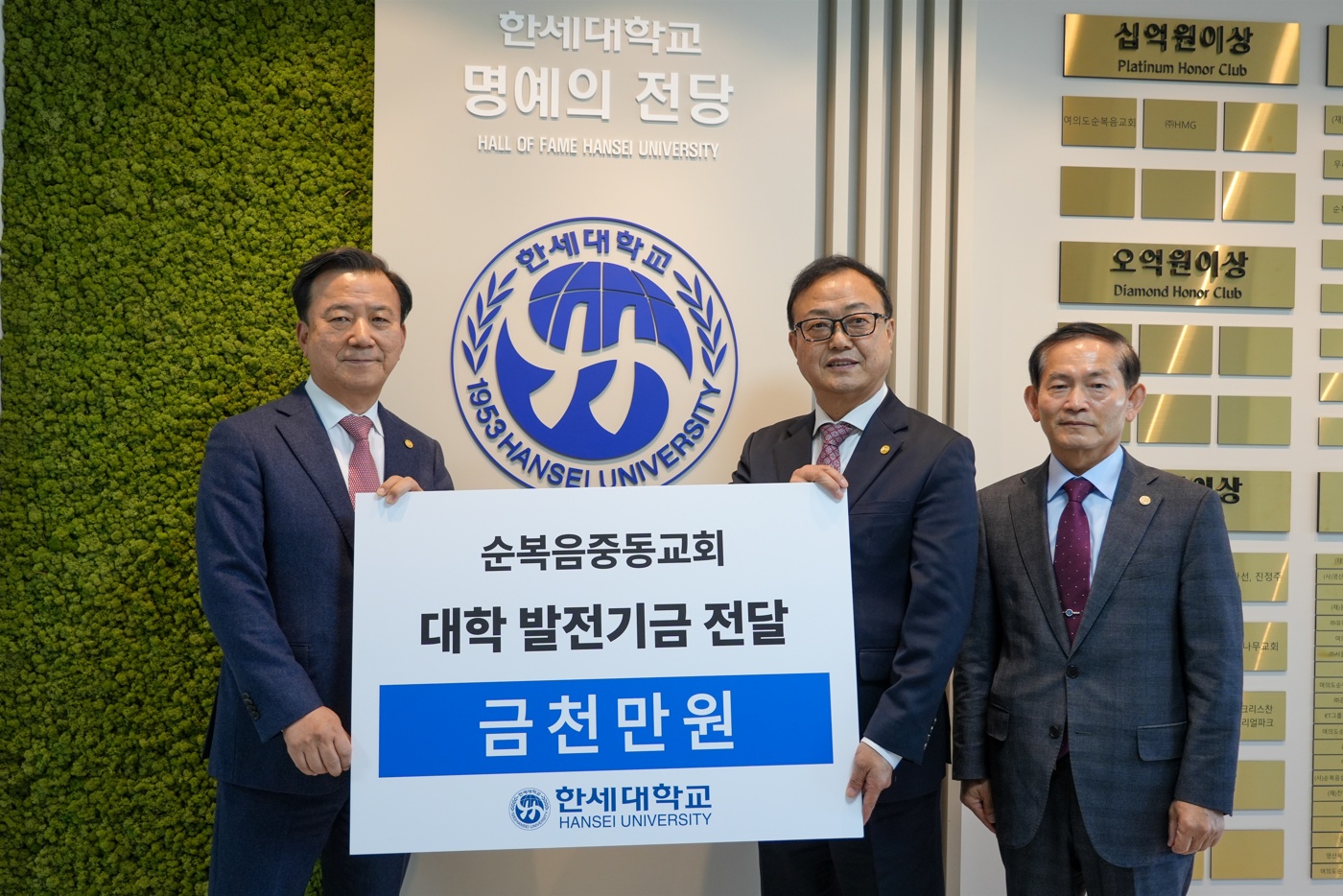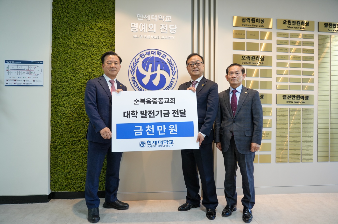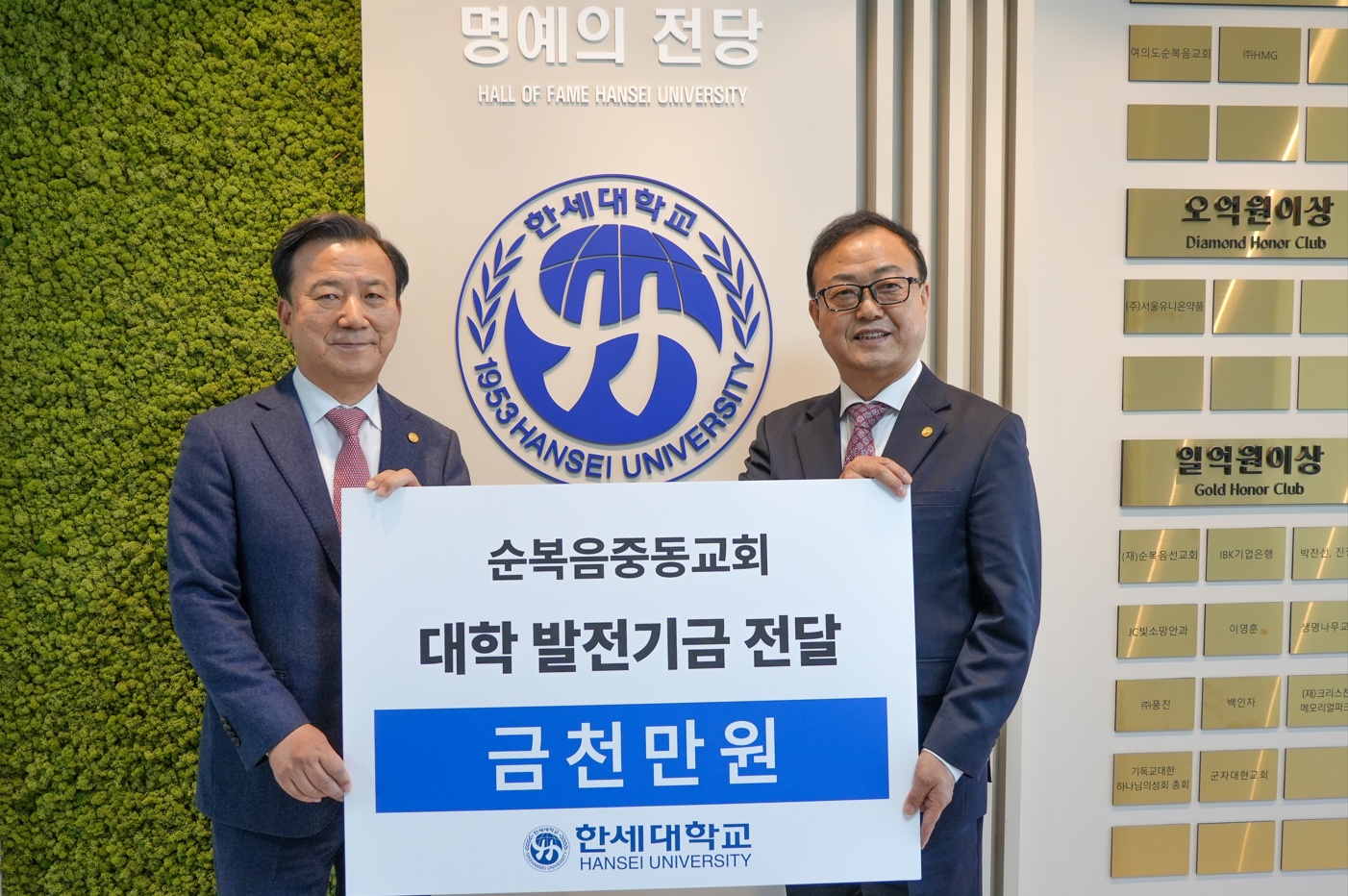 한세대학교(총장 백인자)는 대외협력처 주관으로 순복음중동교회(담임목사 김경문)와 함께하는 ‘발전기금 전달식’을 12일 학교 중회의실과 명예의 전당 등에서 진행하였다.