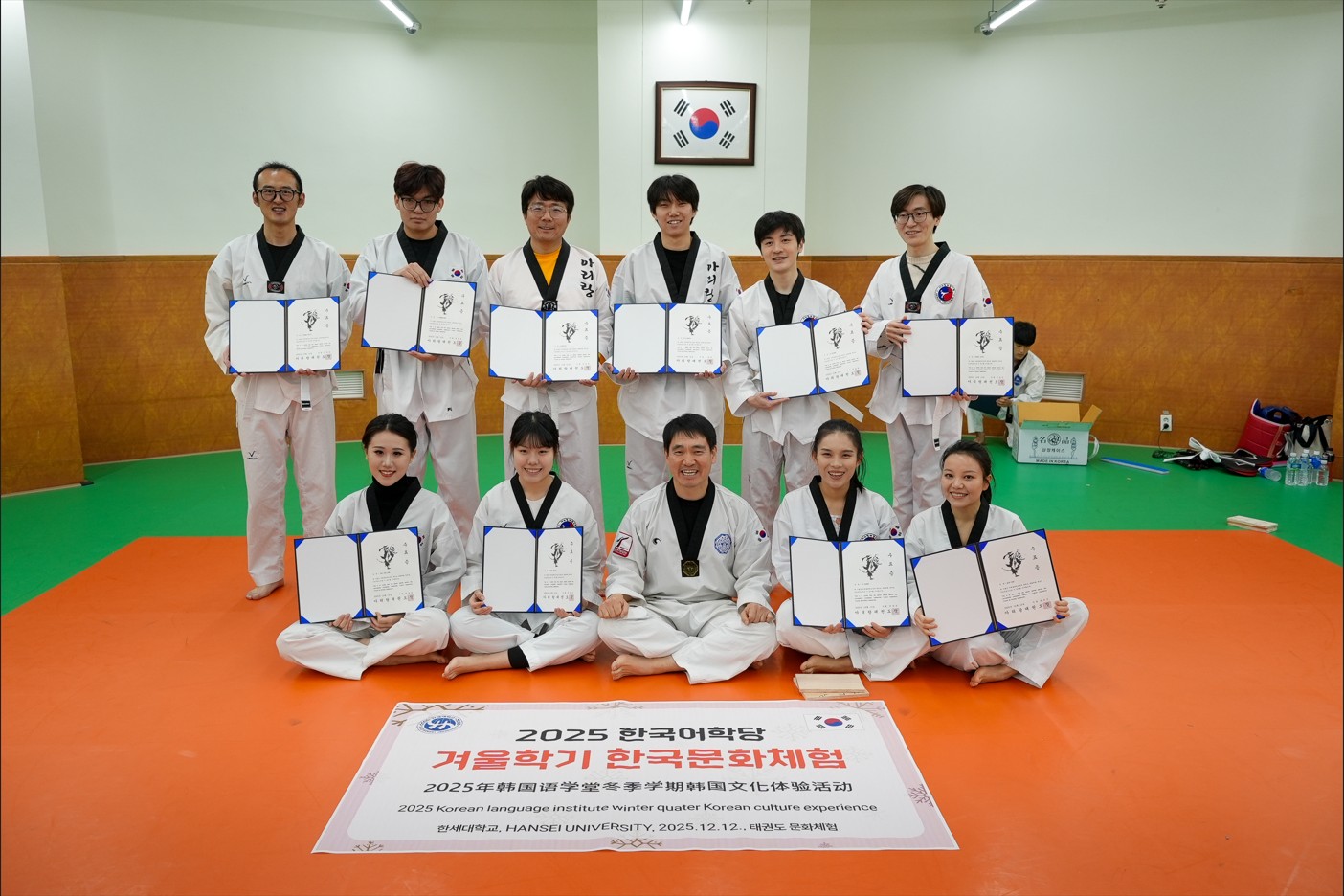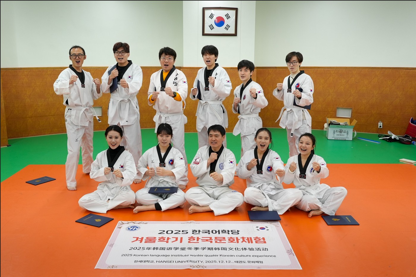 한세대학교(총장 백인자)는 국제교류교육원(원장 최종우) 주관으로 2025년도 겨울학기 한국어 교육과정에 참여 중인 외국인 유학생을 대상으로 태권도 문화 체험 행사를 본관 무도 실습장에서 12일 개최했다.