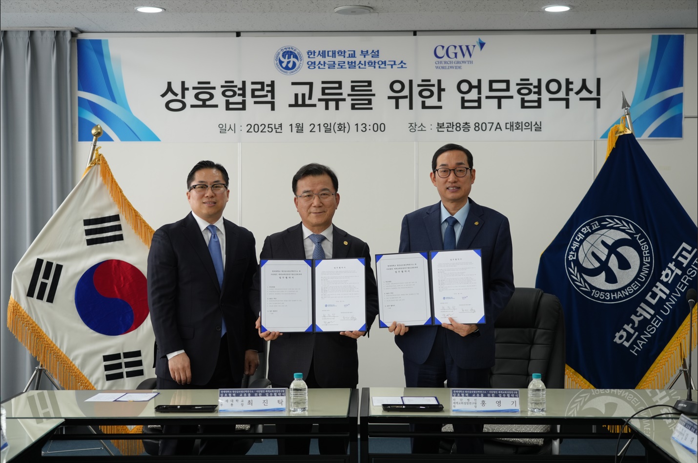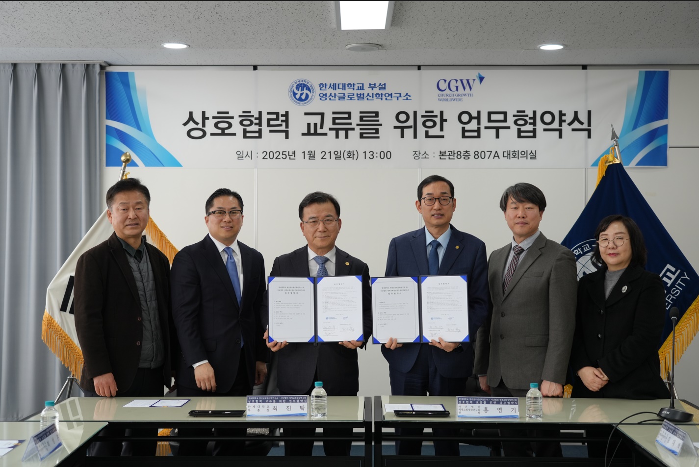 한세대학교 부설 영산글로벌신학연구소(소장 최성훈)는 여의도순복음교회 세계교회성장연구원(원장 홍영기, Church Growth Worldwide, 약칭 CGW)과 군포 한세대에서 업무협약식을 진행하고 ‘오순절 신학을 바탕으로 한국 및 세계교회와 교류하며 신학적 발전, 교회성장 및 선교적 확장’을 위해 협력하기로 21일 발표했다.
