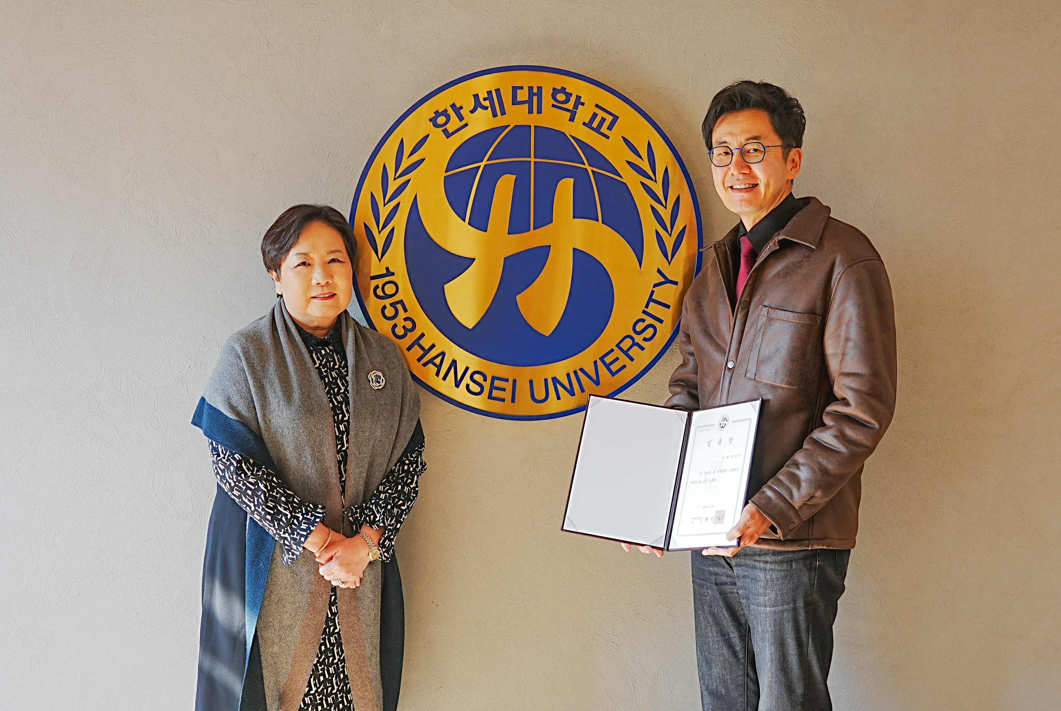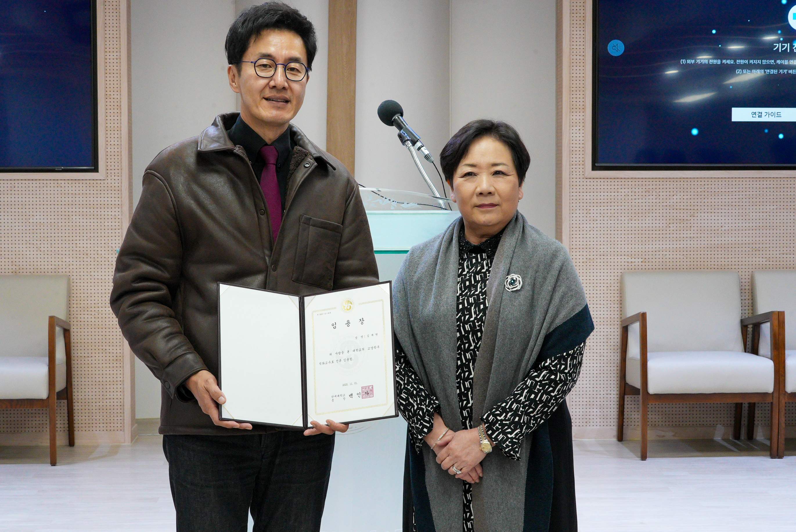 [사진 3. 석좌교수 임용식 행사에서 김재원 교수에게 임용장을 수여하는 백인자 총장]
