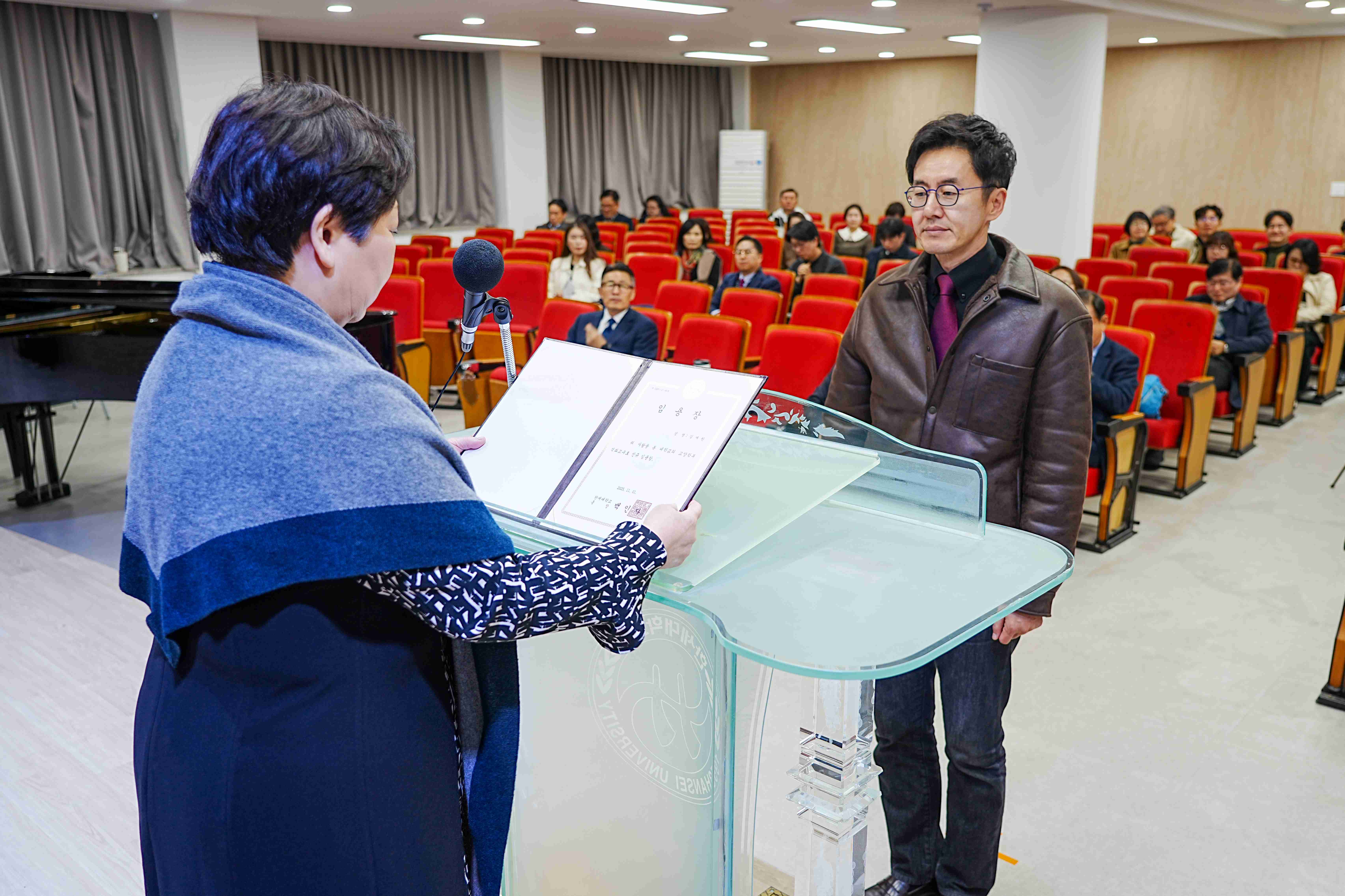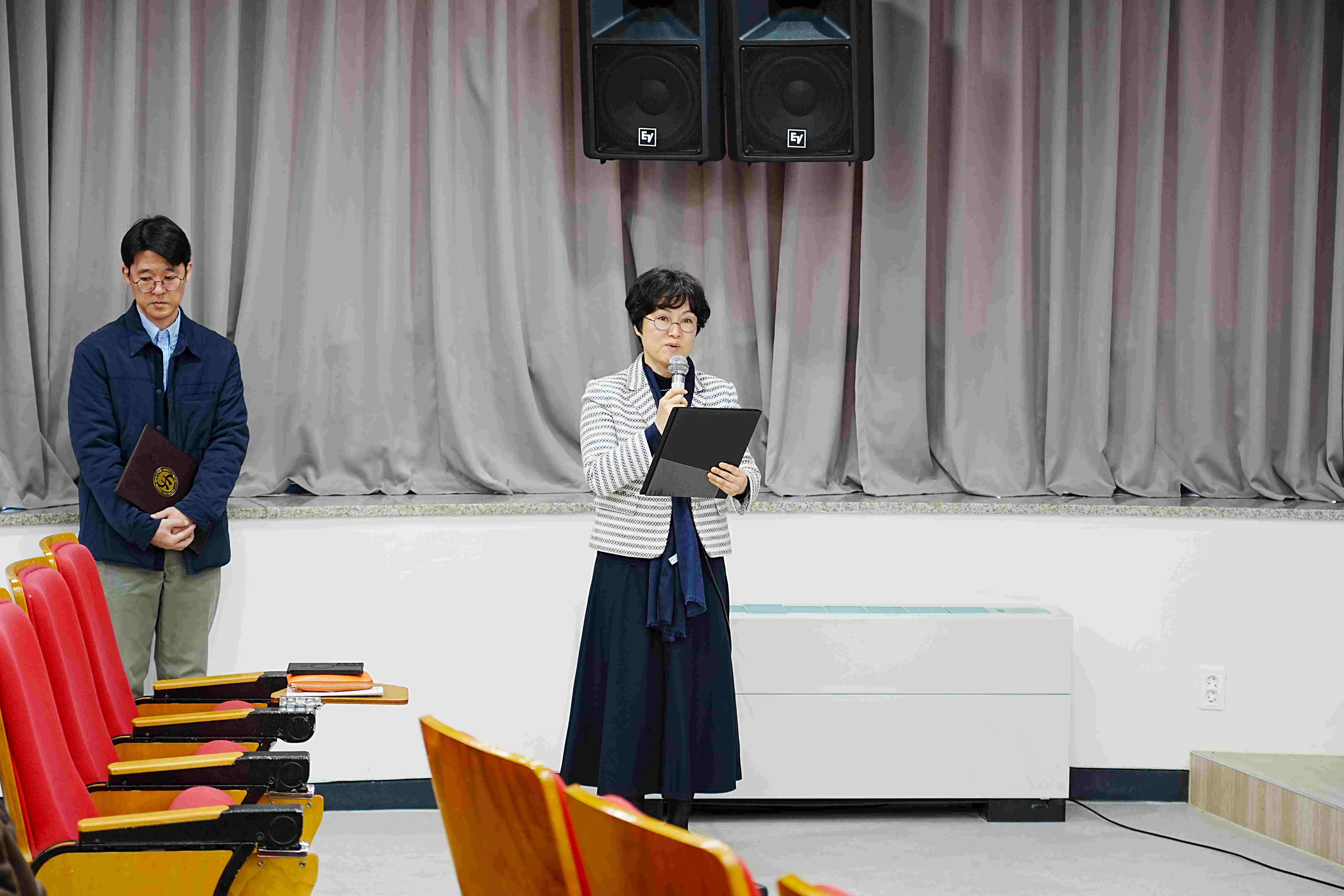 [사진 2. 석좌교수 임용식 행사를 진행하는 임은영 교무처장]