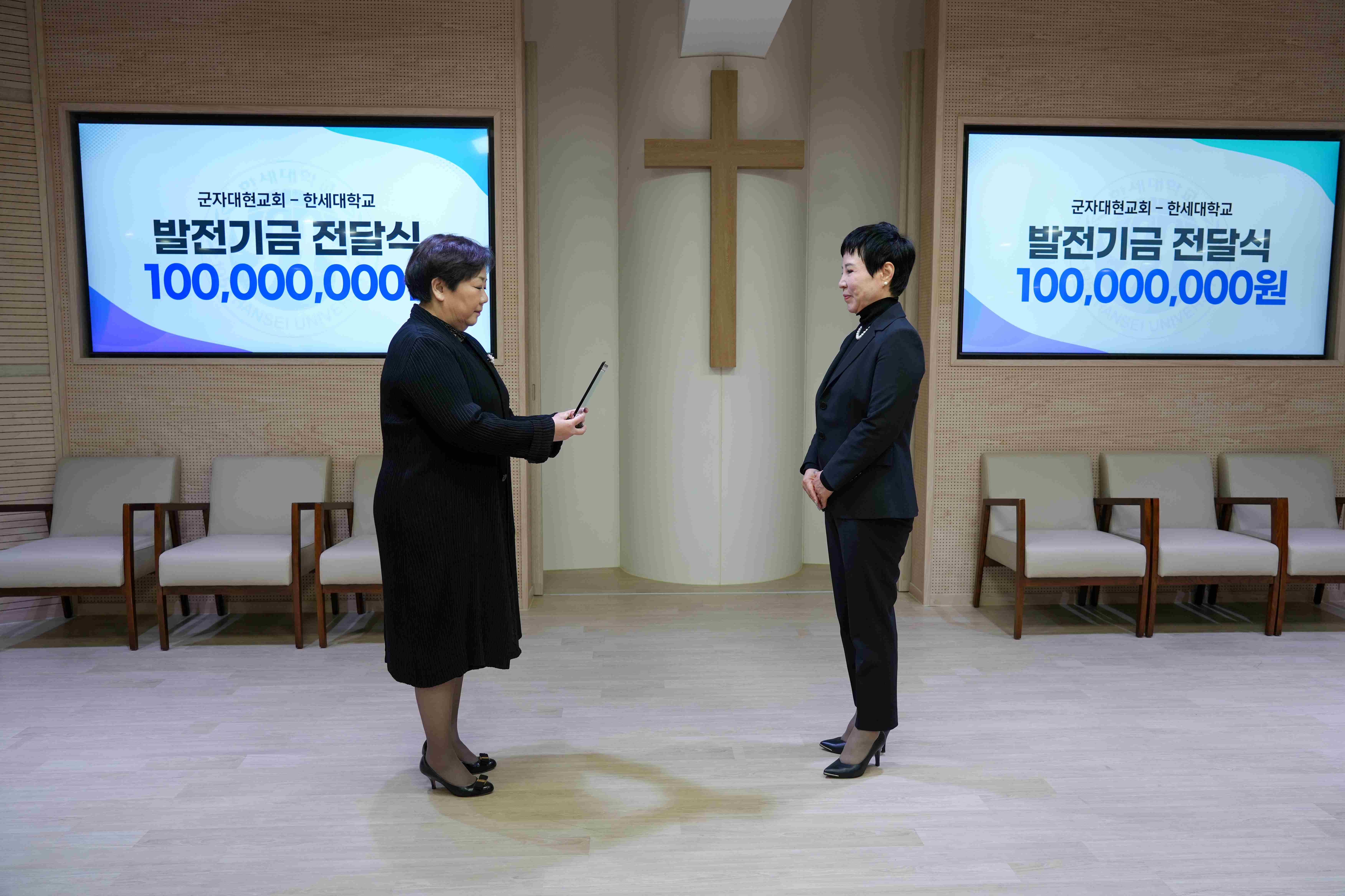 발전기금 전달식에서 기부자 시흥 군자대현교회를 대표한 이희수 목사는 한세대학교 학교 발전 기금 1억원을 상징하는 기부금 판넬을 학교를 대표한 백인자 총장에게 전달했고 학교 구성원을 대표하여 백인자 총장은 기부자 대표 이희수 목사에게 감사패와 기부자 예우 선물을 전달하였다.