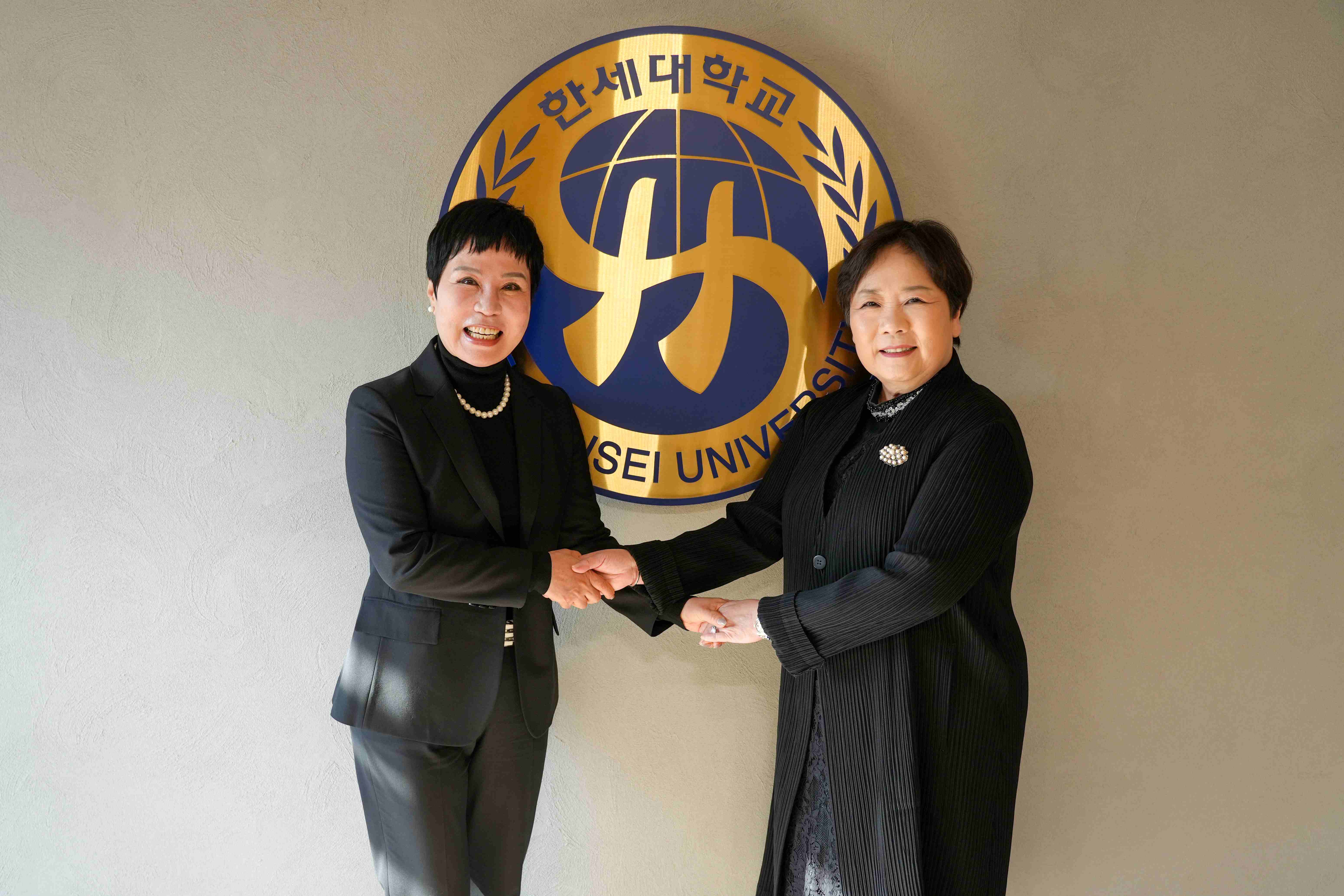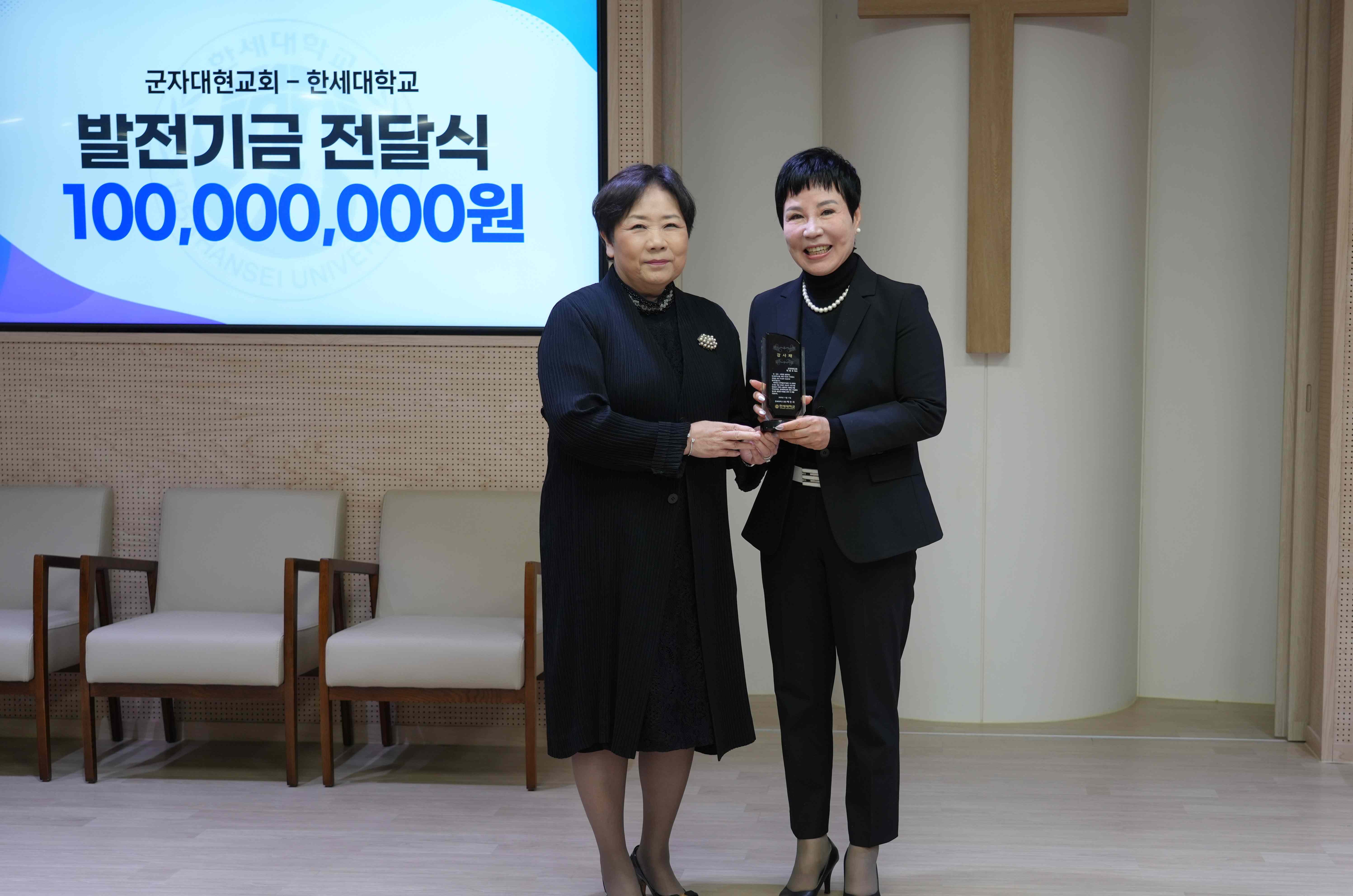 [사진 5. 기부자 군자대현교회 이희수 목사와 백인자 총장]