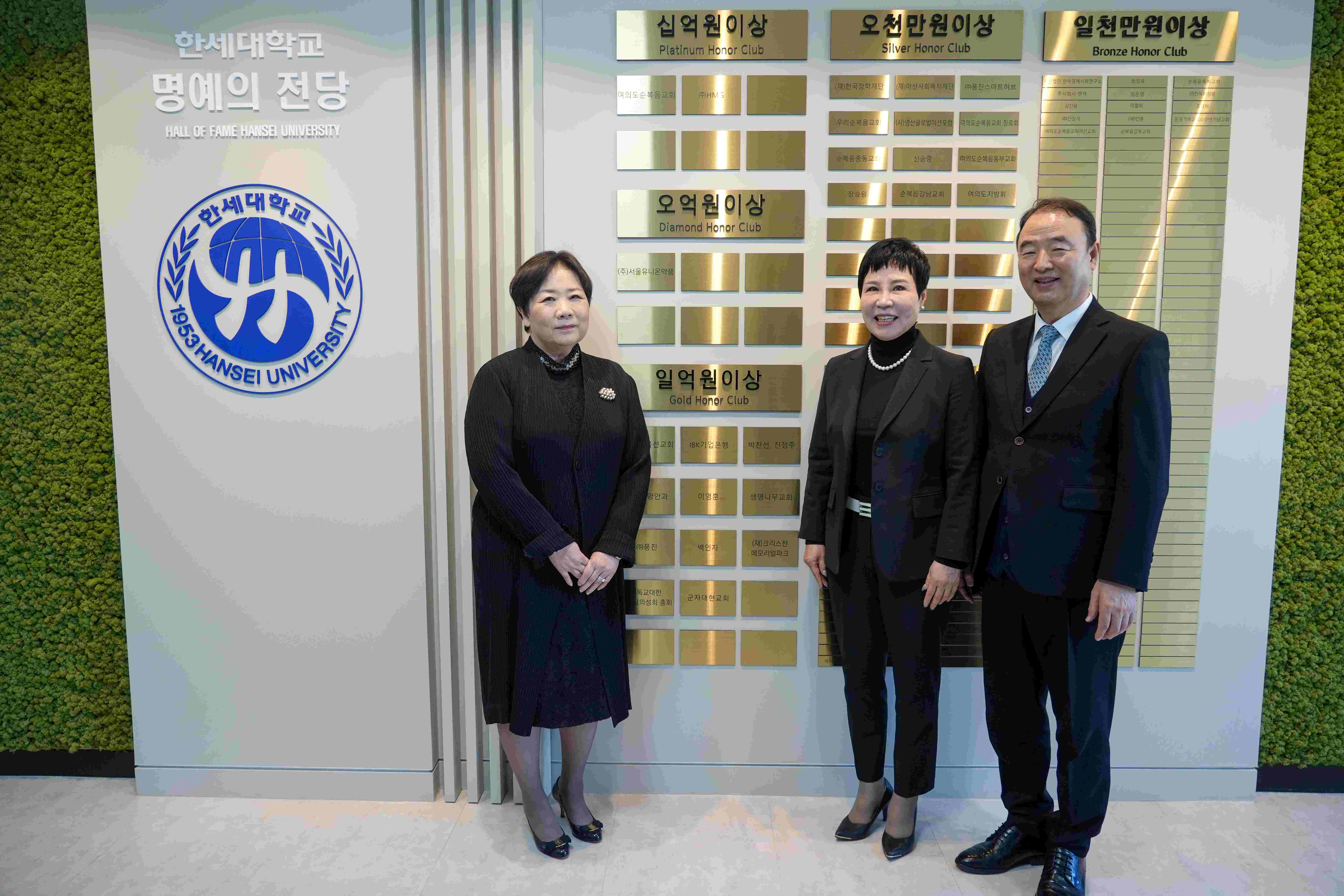 [사진 6. 한세대학교 명예의 전당 배경으로 백인자 총장과 이희수 목사와 박식순 장로]