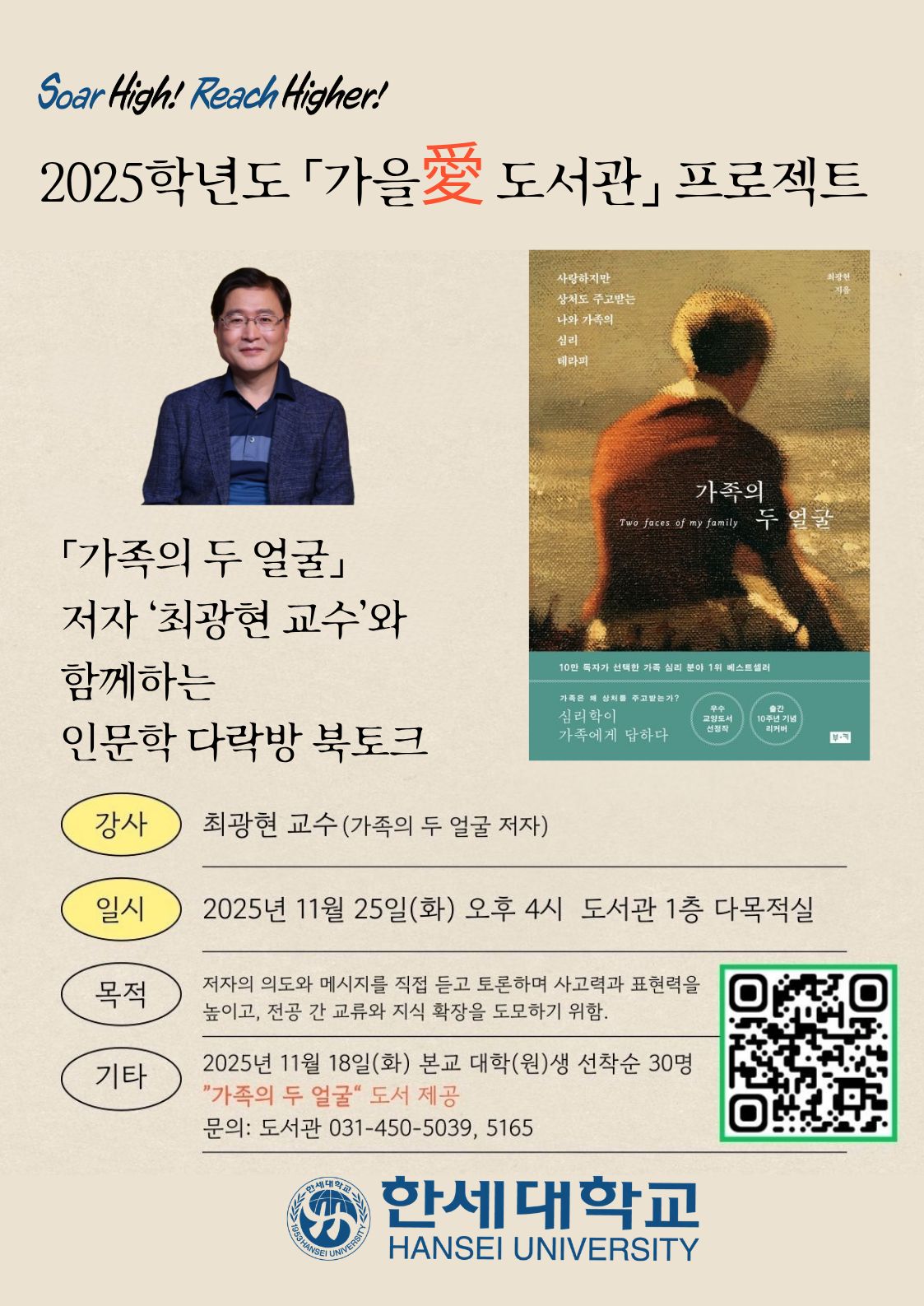 한세대학교(총장 백인자)는 도서관 주관으로 2025학년도 ‘가을愛 도서관’ 프로젝트의 하나인 「가족의 두 얼굴」의 저자 최광현 교수와 함께하는 ‘인문학 다락방 북토크’를 영산비전센터 2층 Learning Commons 홀에서 25일 개최하였다.