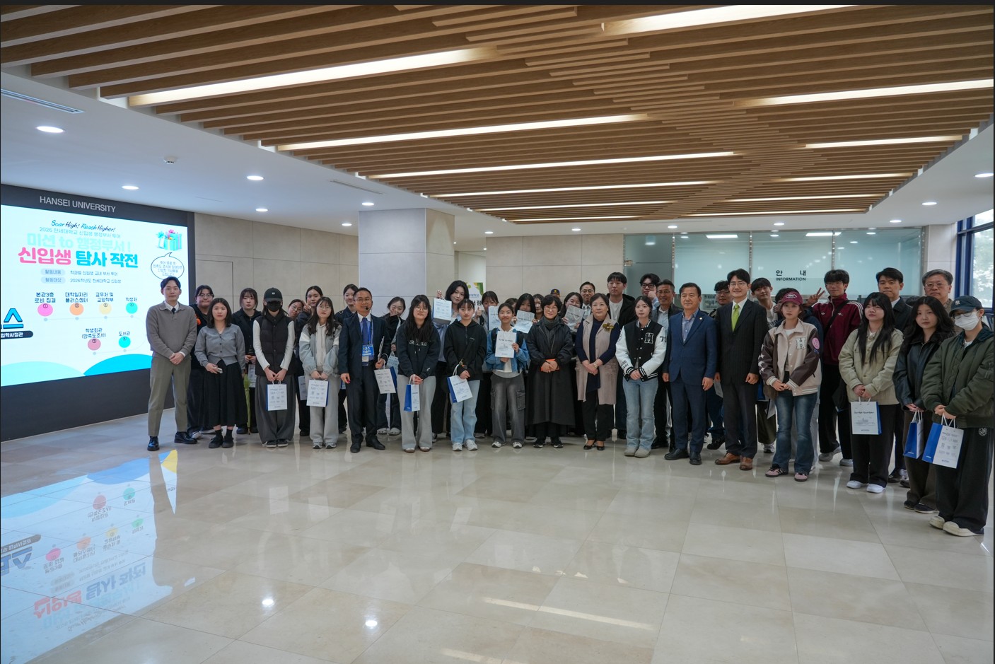 2026년 한세대학교 캠퍼스 투어는 신입생의 대학 생활 적응과 행정 부서별 서비스 인지도 제고를 위해 입학관리본부 관계자들이 신입생을 함께 인솔하여 대학일자리플러스센터, 교무처, 학생처, 상담센터, 도서관, 학생회관 등의 주요 행정 부서와 시설을 방문하고 해당 부서의 업무와 학생 지원 서비스에 대하여 안내받는 시간으로 진행됐다.