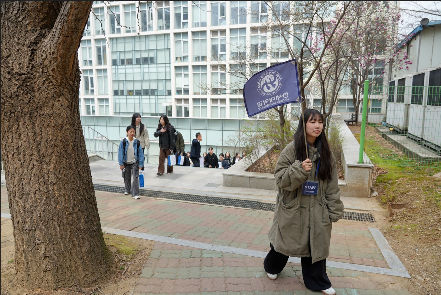 학교 깃발을 들고 캠퍼스 투어 참여 학생을 인솔하는 학생 대표