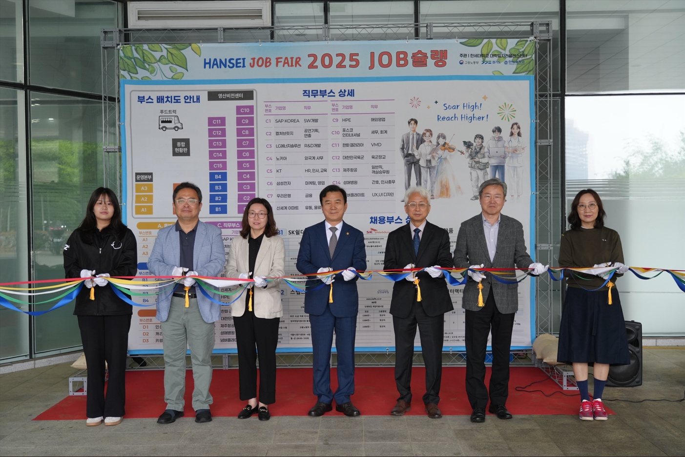 2025 JOB슐랭 행사는 대학일자리플러스센터 한근수 팀장의 사회로 한세대 최진탁 부총장, 유대현 부총장, 노기선 행정처장, 장남경 센터장, 김도연 총학생회장, 고용노동부 안양고용복지플러스센터 김명재 소장, 경기남부일자리협의회 이형열 회장 등이 참석하여 개막행사를 진행했다.